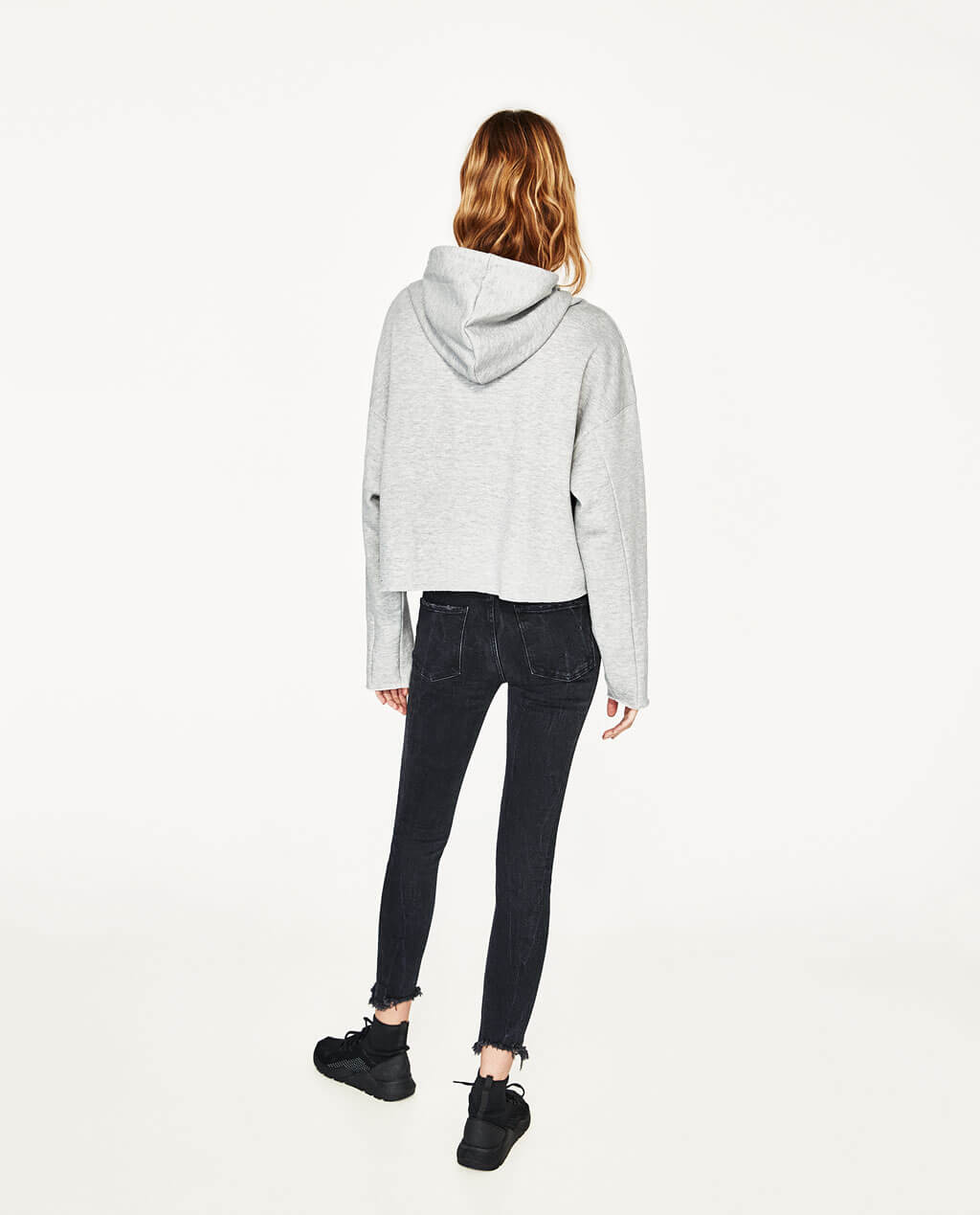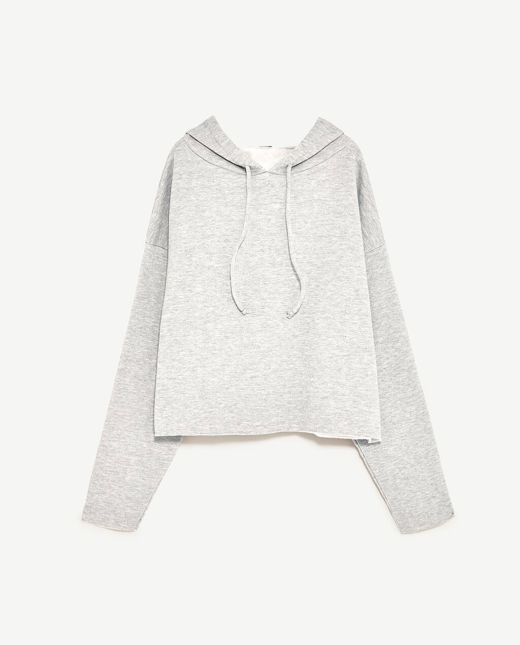 Gray sweatshirt with a lined drawstring hood. Soft, brushed inside.
