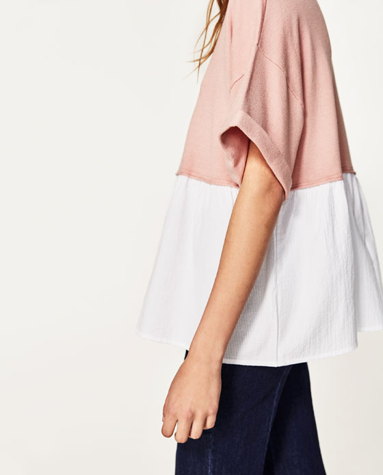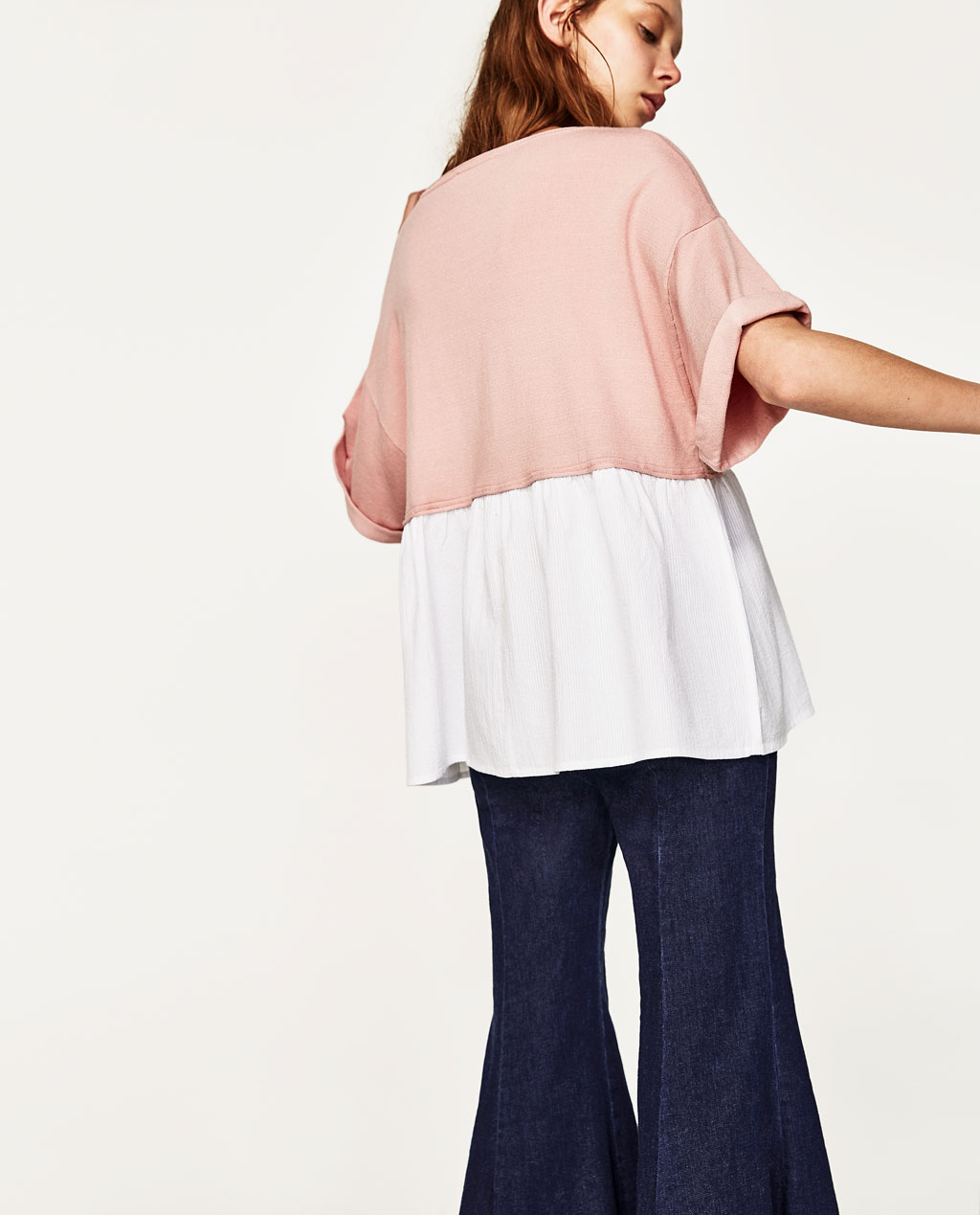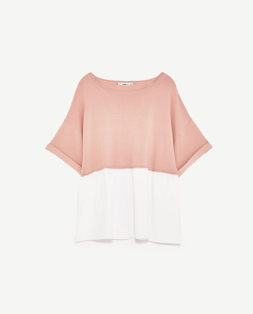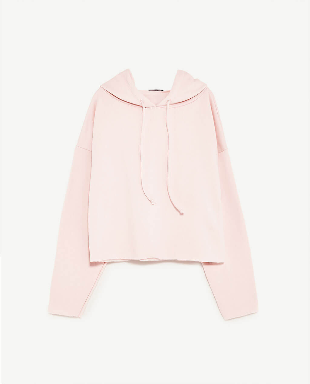 Pastel pink sweatshirt with a lined drawstring hood. Soft, brushed inside.
